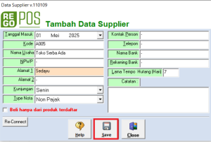 Langkah 6. Apabila sudah terisi, klik tombol Save untuk menyimpan Data Supplier.
